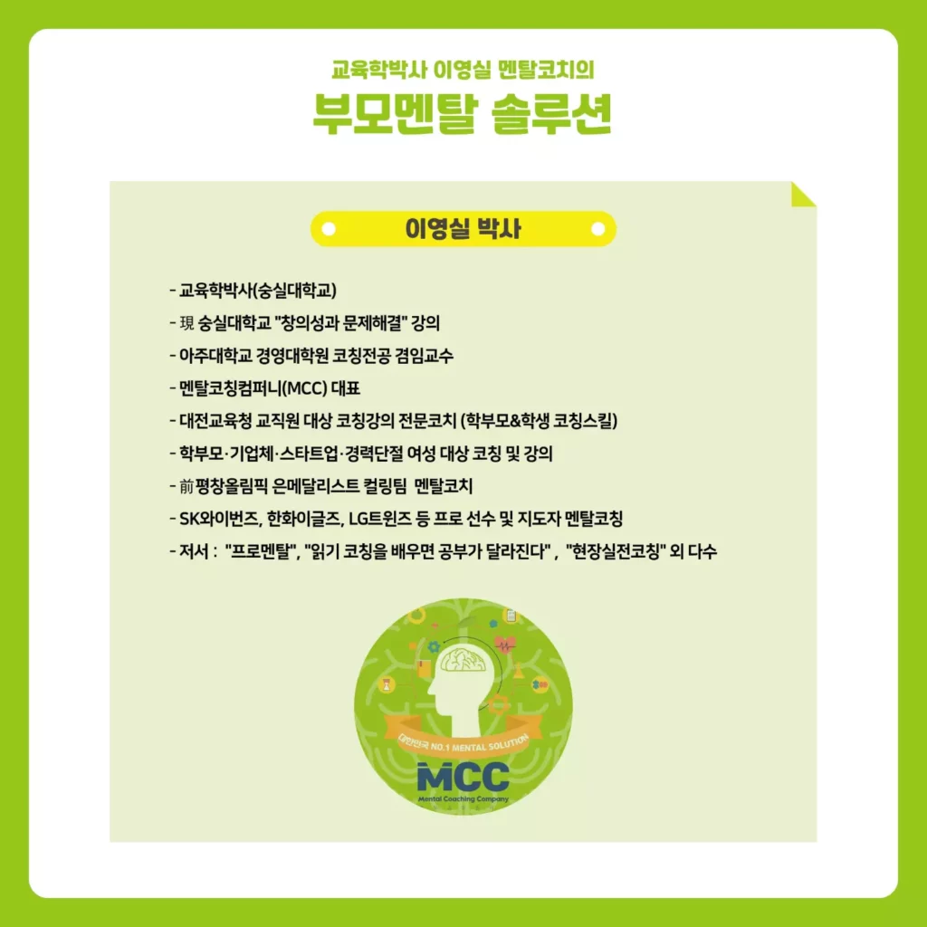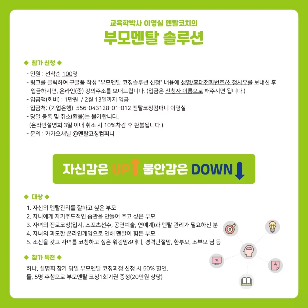 [부모멘탈 코칭솔루션] 급변하는 시대 반드시 필요한 부모멘탈은 무엇일까요? 부모멘탈 코칭솔루션 참가신청서급변하는 시대 반드시 필요한 부모멘탈은 무엇일까요? 부모멘탈코칭 설명회에서 그 해답을 찾아보세요!!! 온라인 링크 발송 : 입금확인 후 문자와 이메일로 발송(문의 카카오채널 @멘탈코칭컴퍼니) 참가 신청서 작성 Previous Post “쇼미더스타트업” IR피칭데이 사전투표 안내 Next Post <칼럼>인생 올림픽과 셀프 멘탈코칭(2022.2.25)